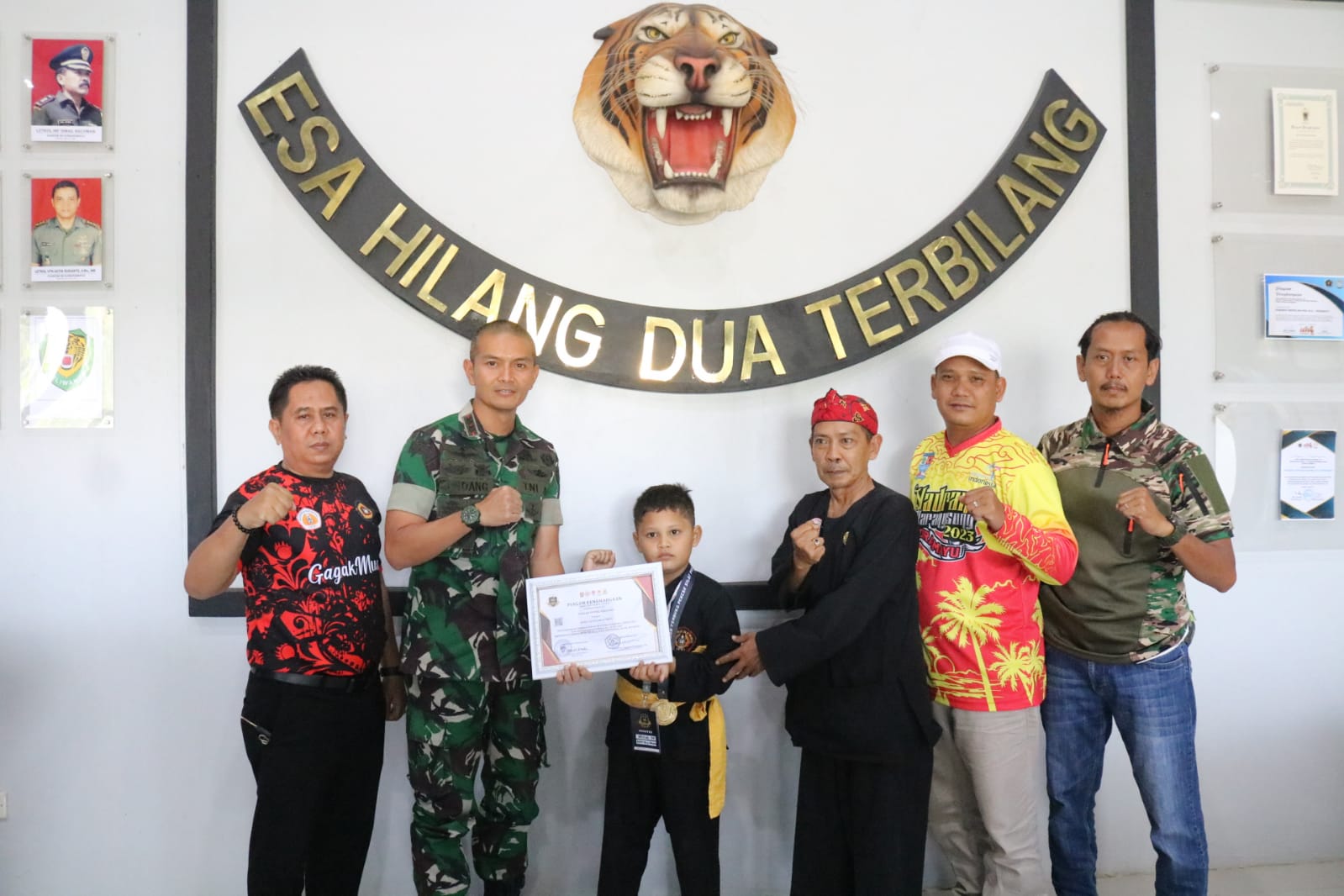 Min.co.id.-Indramayu-Kodim 0616 Indramayu Letkol Arm Andang radianto memberikan penghargaan kepada pemenang juara 1 ananda Gencar Putra Maulana putra dari Maulana Malik Ibrahim dengan kategori tanding pada kejuaraan terbuka Pencak Silat Piala Kasad Ke-1 tahun 2023.