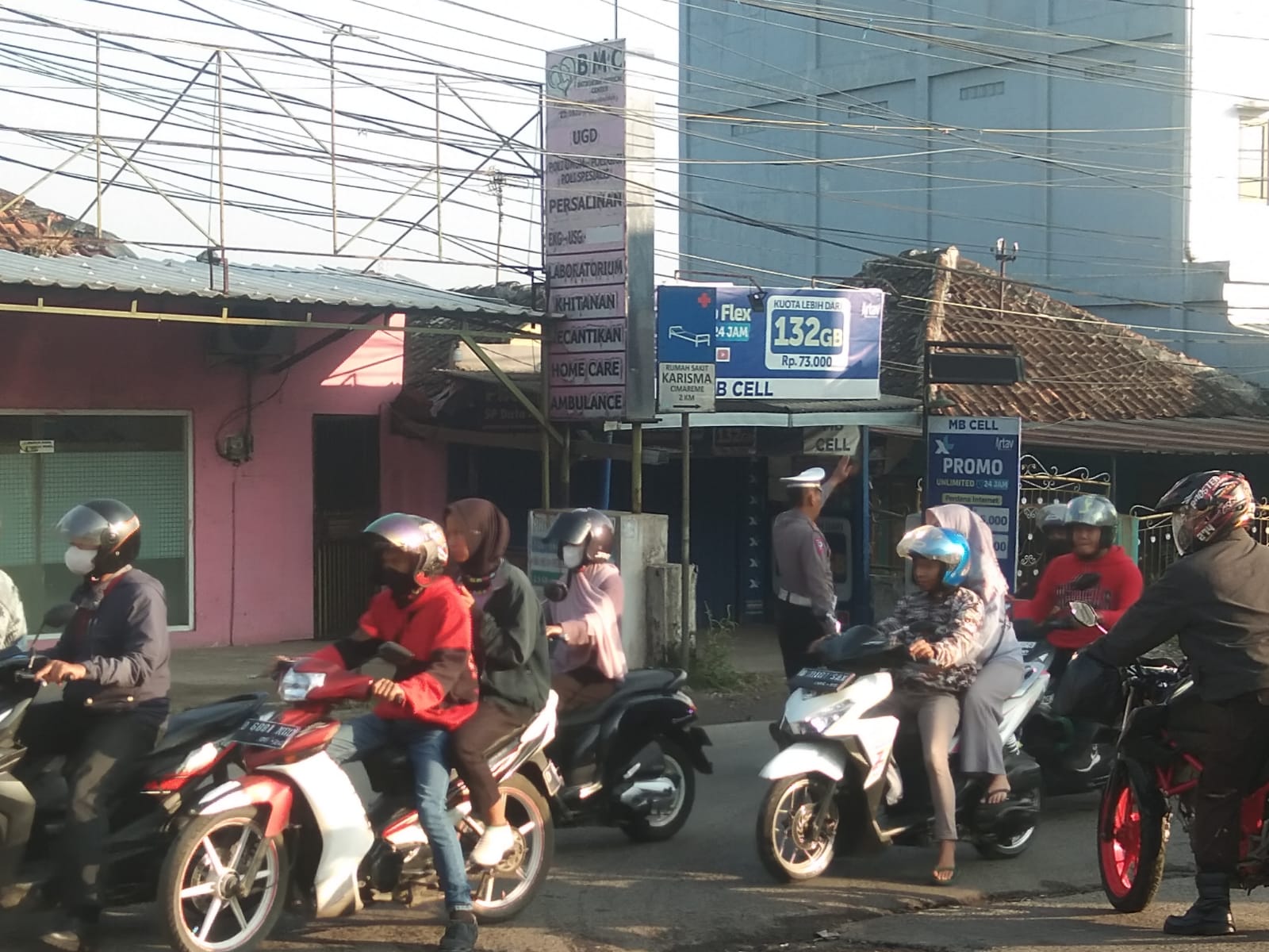 Anggota Unit lalu lintas Polsek Batujajar AKP Tarmubi Antensi melaksanakan pemantauan lalulintas di Depan mako dan di Pos Gatur Cangkorah, Graha Kencana pada Rabu (14/06/2023) .