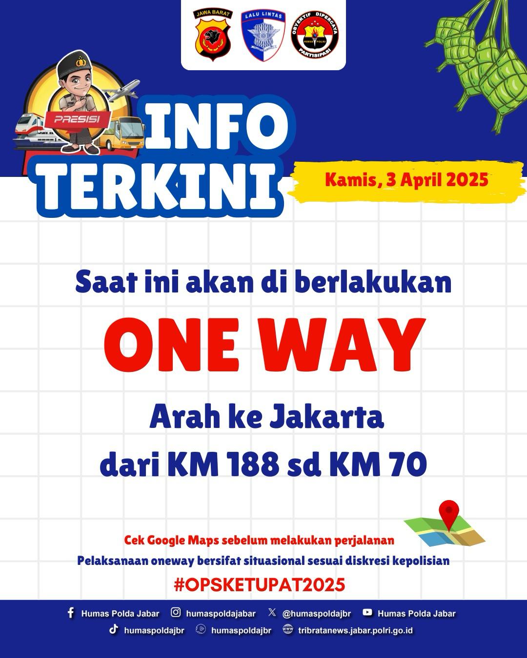 Kabid Humas Polda Jabar Kombes Pol. Jules Abraham Abast S.I.K. mengatakan bahwa Direktorat Lalu Lintas (Ditlantas) Polda Jawa Barat memberlakukan rekayasa arus lalu lintas satu arah atau one way dari Km 188 ke Km 70 Tol Cipali untuk menghadapi kepadatan kendaraan pada arus balik lebaran 2025, Kamis (3/4/2025)