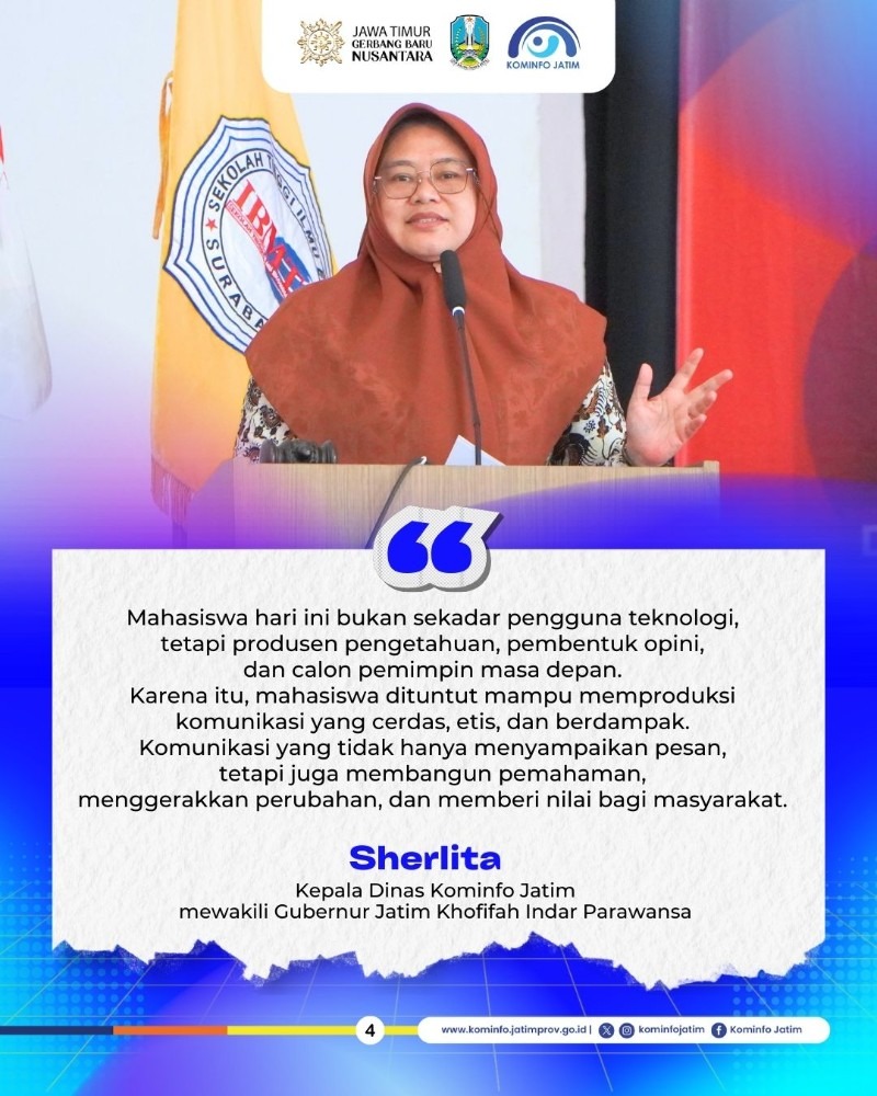 Mewakili Gubernur Jawa Timur Khofifah Indar Parawansa, Sherlita menyampaikan bahwa peran mahasiswa kini semakin strategis dalam membangun arah demokrasi yang hijau, adaptif, dan berkelanjutan. Menurutnya, kecanggihan teknologi harus diimbangi dengan kecerdasan komunikasi dan integritas moral.
