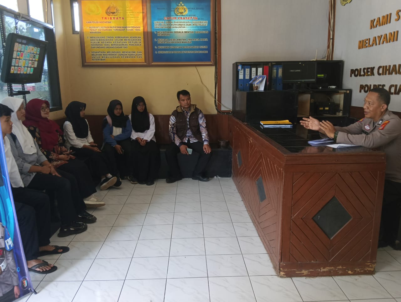 Kedatangan para siswa-siswi ekstrakurikuler Patroli Keamanan Sekolah (PKS) dan Guru pendamping disambut hangat oleh jajaran Polsek Cihaurbeuti Polres Ciamis Polda Jabar. Kepala SPKT Polsek Cihaurbeuti Aipda Dede Romansyah, SH., menyambut dan mendampingi langsung siswa siswi ekstrakulikuler Patroli Keamanan Sekolah.